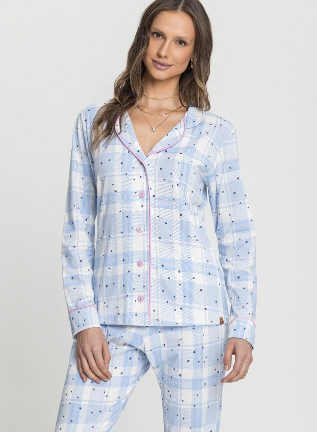 Pijama estilo americano, confeccionado em 100% algodão, apresenta botões funcionais e delicados detalhes em filetes rosa claro, proporcionando versatilidade para diversas ocasiões. Seja para o pós-cirúrgico, amamentação ou simplesmente para estar confortável em casa, ele é a escolha perfeita. Sua modelagem mais ampla e gola estilo camisaria americana garantem elegância e conforto.